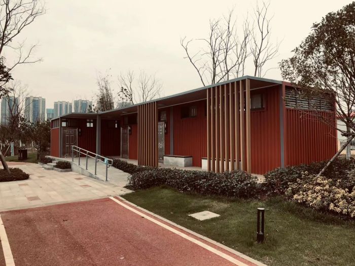 拼裝廁所;在廠里做好各個廁所部件,再到現場組裝在一齊,適合不易運輸的大型廁所。這座箱式廁所,女廁5個蹲位內配工具間,男廁2個蹲位+2小便斗,第三衛生間由殘疾馬桶、助力洗手盆和兒童馬桶、兒童洗手盆外加嬰兒臺等設施。廁所前后有窗,通風采光,前部走廊裝有屋檐,防雨防曬。此廁所位于公路綠道邊,整體大氣,功能齊全,造型美觀,是一道難得的靚麗景觀!